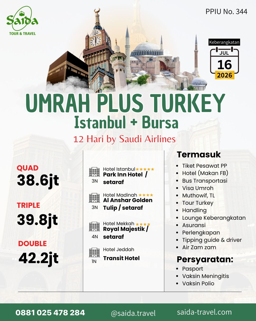 Umroh Plus Turkey 12 Hari Istanbul + Bursa Tulips by Saudia Airlines